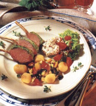Die Toastscheiben fein reiben. ( Falls sie noch weich sind , kurz antoasten und auskühlen lassen ) . Thymian und Petersilie fein hacken und mit den Toastbrotbröseln dem Senf und dem Ei vermengen. Das Lammkarree mit Salz und Pfeffer würzen und in einem Bräter in 4 EL Öl scharf anbraten. die Kräutermasse darauf verteilen. Das Lammkarree bei 180 Grad Celsius ( Umluft 160 , Gas Stufe 3 ) im vorgeheizten Backofen ca. 15 min braten. Die geschälte Zwiebel und die geputzte Zucchini würfeln . Paprika putzen, waschen. von der roten Paprika 1/8 zurückbehalten, die restlich grob würfeln . zuerst die Zwiebelwürfel in 2 El Öl andüsten Dann die Paprika- , die Zucchiniwürfel und 6 geviertelte Oliven zufügen. Würzen und 3-4 Minuten garen . Die Gnocchi kurz in köchelndem Salzwasser garen und in einer Pfanne mit der Butter schwenken. Die restliche Paprika fein Würfeln und die restlichen Oliven hacken. Beides mit der Remoulade vermengen und auf einem Salatblatt dekorativ anrichten. Das Lammkarree in einzelne Koteletts schneiden. Zusammen mit den Gnocchi, dem Gemüse und der Remoulade servieren .