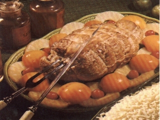 1 Kg Kalbsbraten in Speck eingewickelt , Pflanzenfett zum Anbraten , 2 Gläser Kirschlikör , etwa 1/4 Liter Brühe , Pfeffer , Salz , 6 zerkleinerte Schalotten , 1Suppengrün Thymian , Lorbeer , 1/8 l frische Sahne , 1/2 Büchse in Scheiben geschnittene Ananas 1/2 Kg Büchse halbierte Pfirsiche , etwas Zimt 1 kleine Büchse Kirschen , 1 1/2 Tassen Langkornreis .