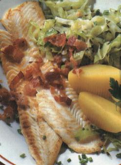 01 braten, herausnehmen. Schollen mit Mehl bestäuben, im Speckfett auf jeder
